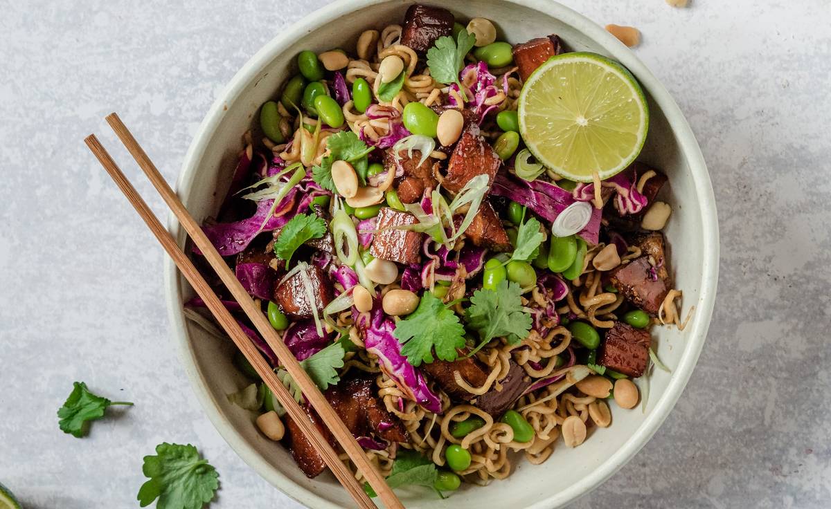 Hacka salladslök och rödkål fint och lägg i en stor skål. Tillsätt edamamebönorna, resten av sojasåsen och saften från lime och nudlar.