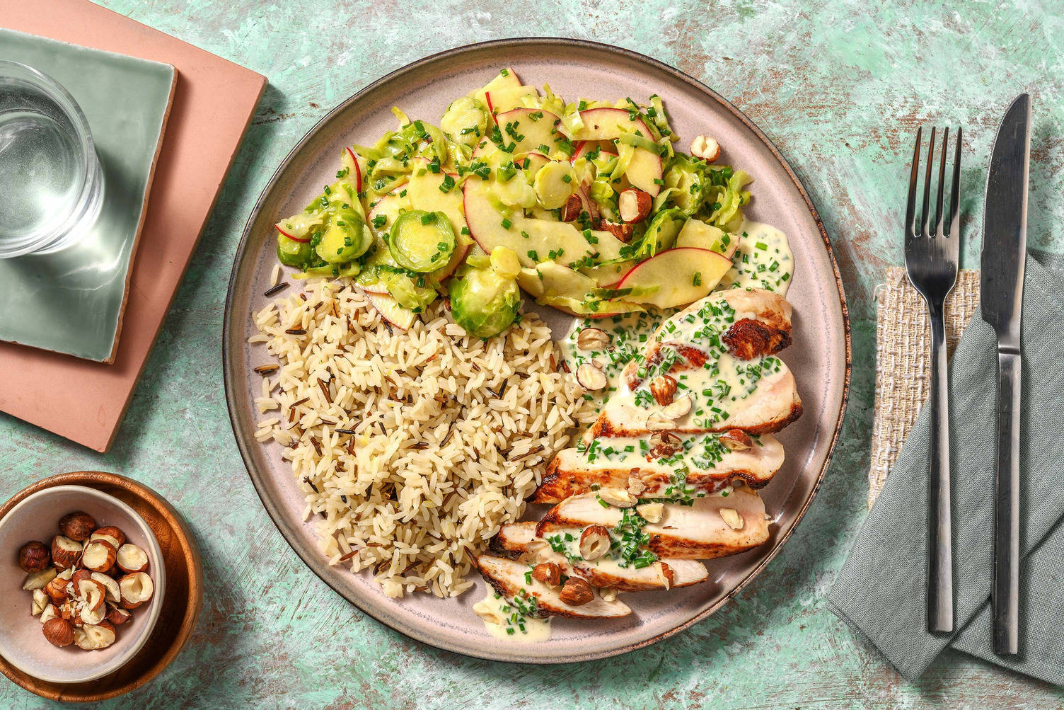 Strö hasselnötter över smördegstrianglar.