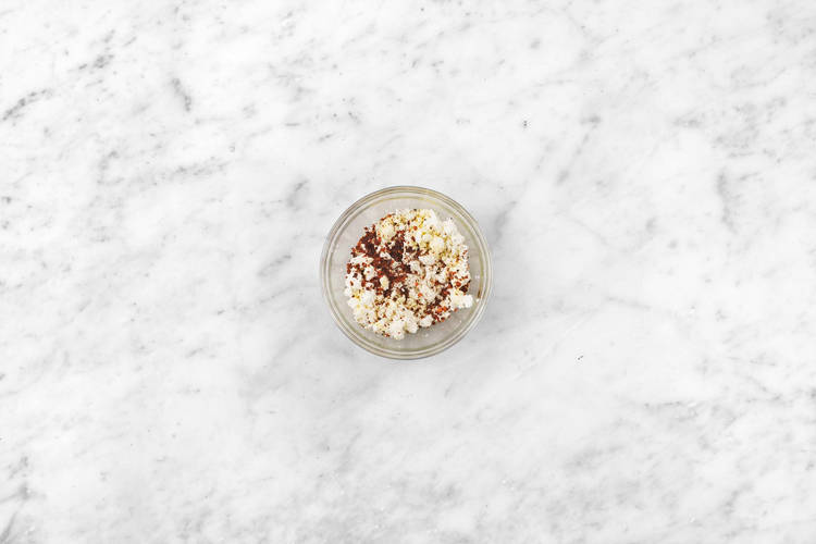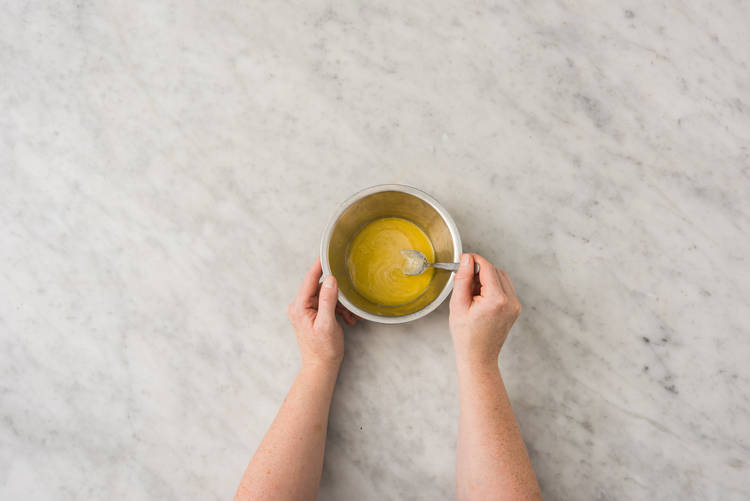 Under tiden, blanda tahini, yoghurt, vatten, socker, salt och en nypa peppar i en liten skål.