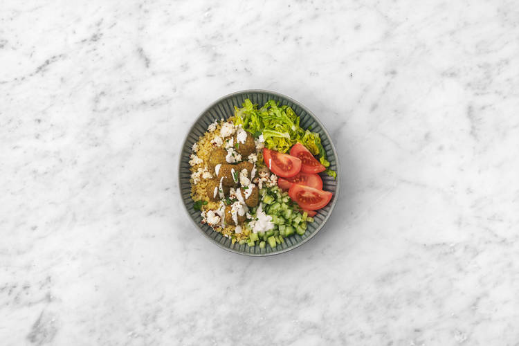 Lägg upp bulgur och grönsaker i skålar och toppa bulgur med falafel.