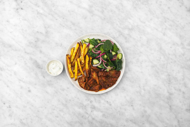 Här kommer ett recept som bevisar att vegetarisk mat verkligen inte behöver vara tråkig! Vi låter oss inspireras av det indiska kökets fantastiska smaker och lagar panerad ostronskivling med en glaze på tikka masala och aprikoschutney. Samtidigt rostar vi pommes med ingefära och sesamfrön och svänger ihop en gurksallad med syltad rödlök. En gräddfilsdressing med majonnäs och koriander blir ett svalkande komplement till denna smaksensation.