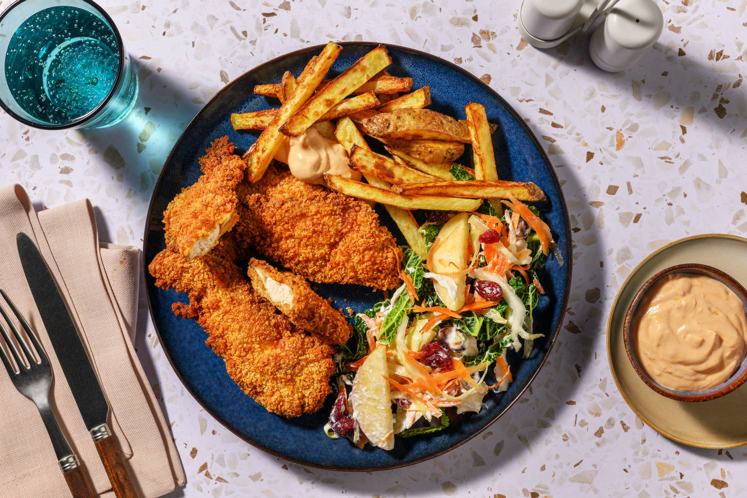Lägg upp klyftpotatis, falafel och kålsallad på tallrikar. Toppa med resterande ranchdressing och gräslök.