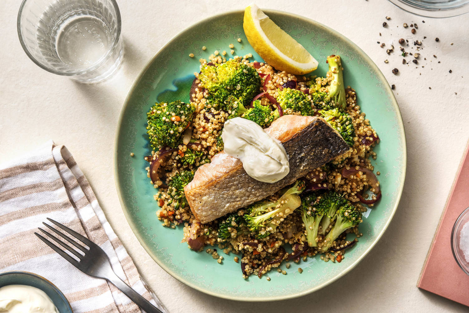 med vitlöksstekt broccoli och sesammajonnäs