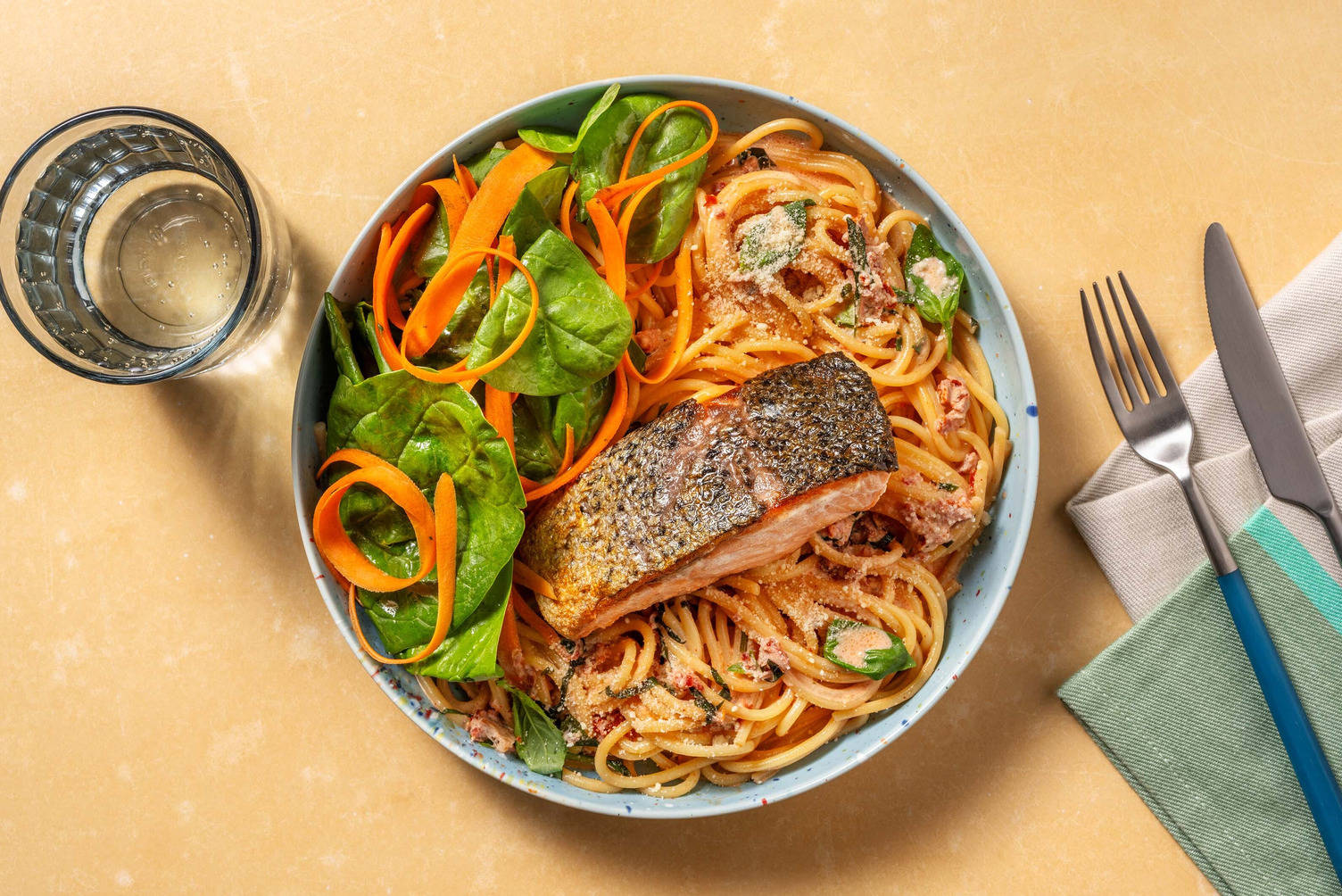 med spaghetti och morot- och spenatsallad