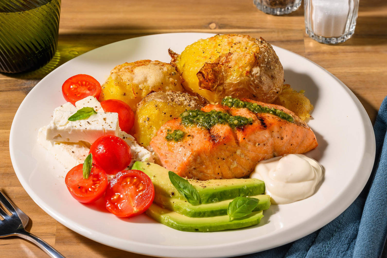 med pestotoppad krossad potatis