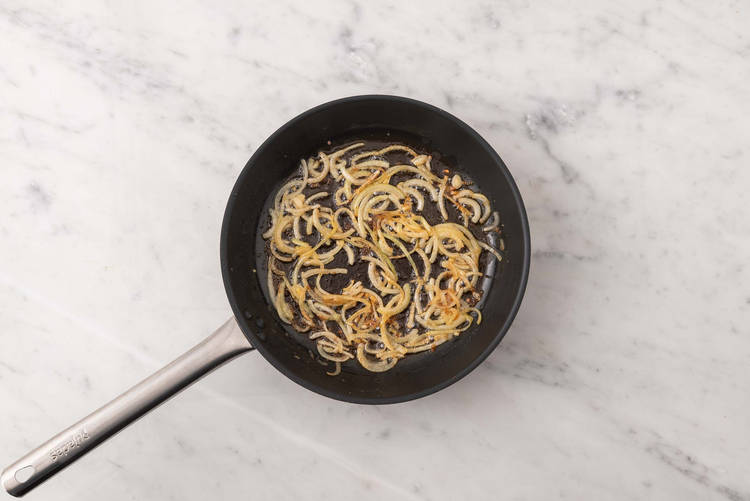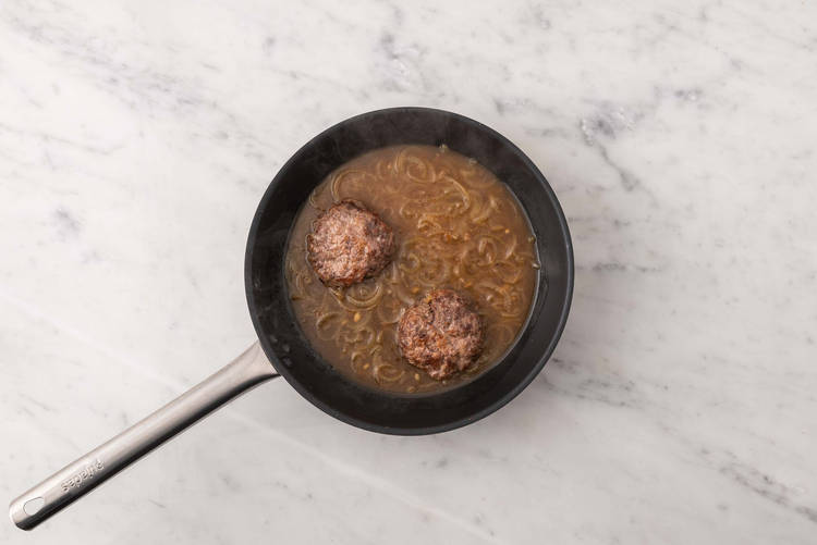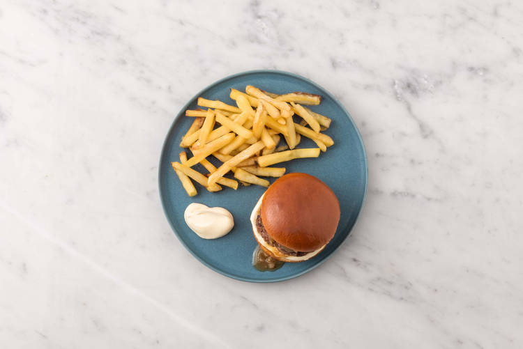 med löksky-glaze och pommes frites